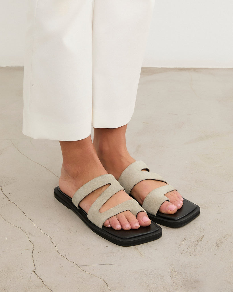 Sandalia plana de piel topo con puntera cuadrada. Varias tiras en foirma de zigzag y posición para dedo.