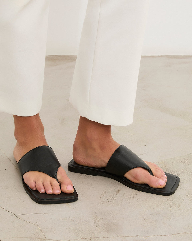 Sandalia plana de piel negra con puntera cuadrada. Tira grusa con posición para dedo.