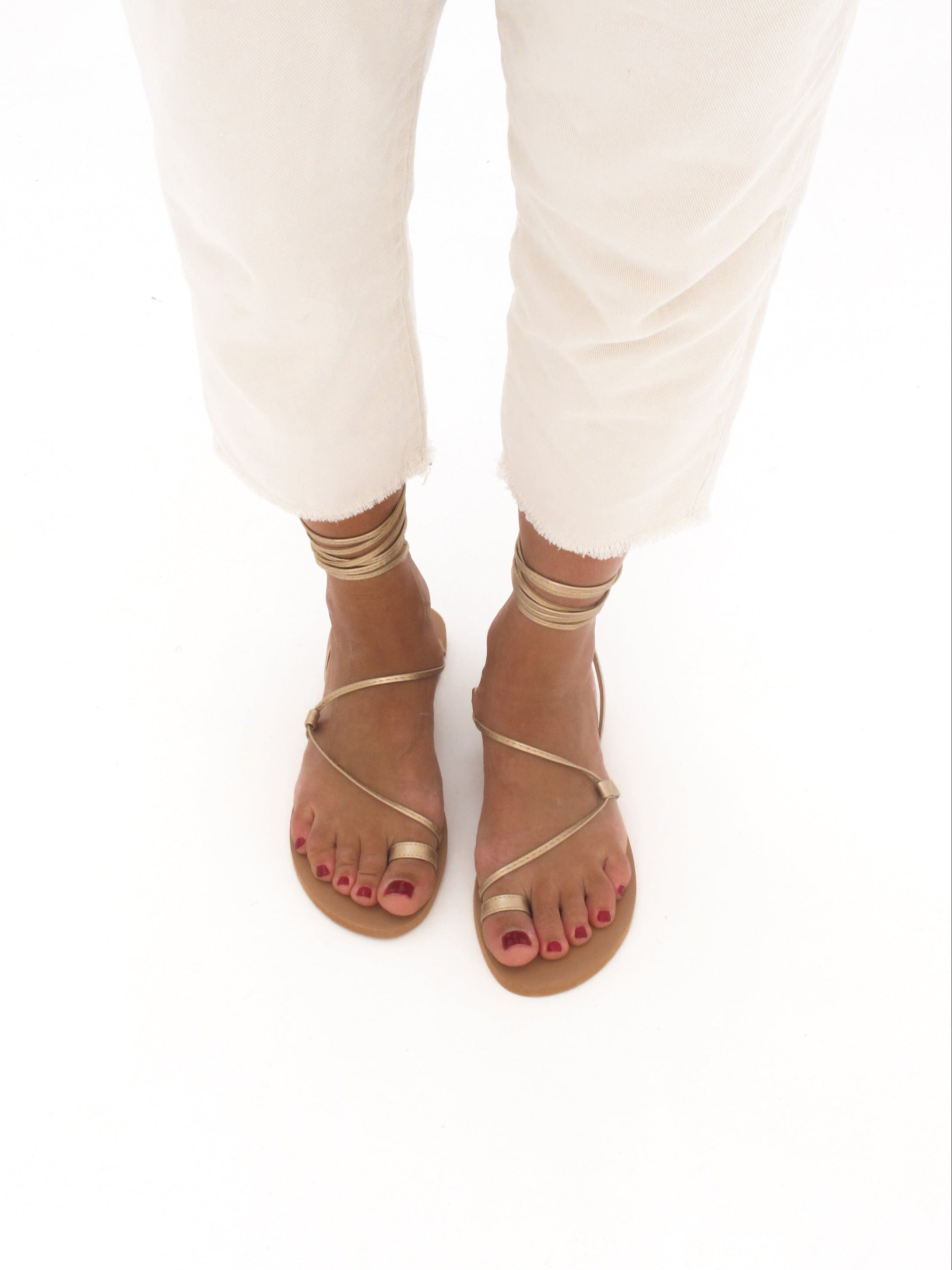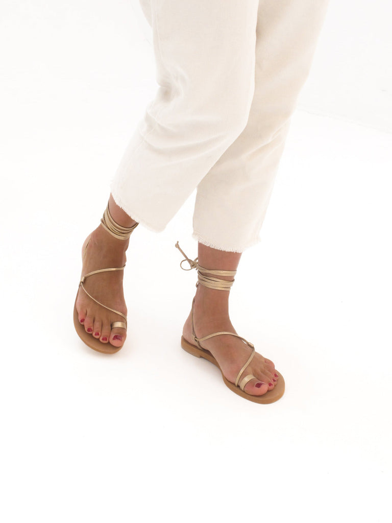 Sandalia plana en cuero vegano dorado. Tira para dedo pulgar y dos finas y largas tiras, para sujeción en tobillo con varias vueltas.